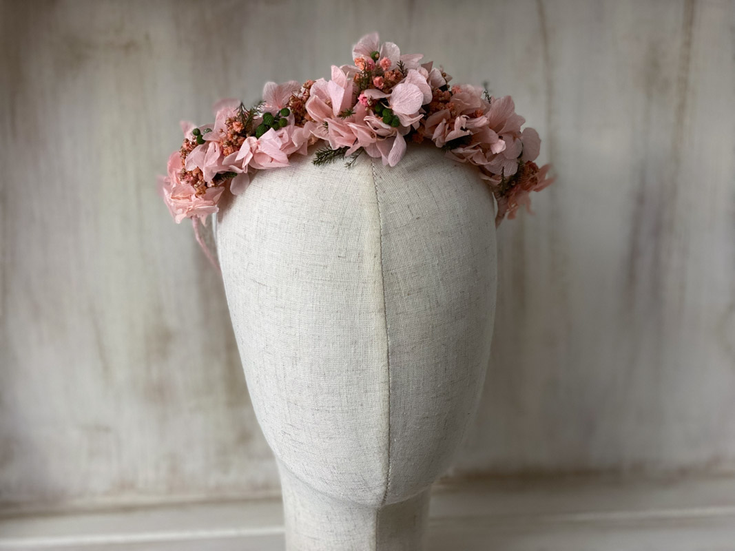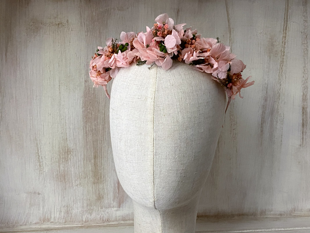 Diadema de comunión realizada en flores preservadas en tonos pastel.